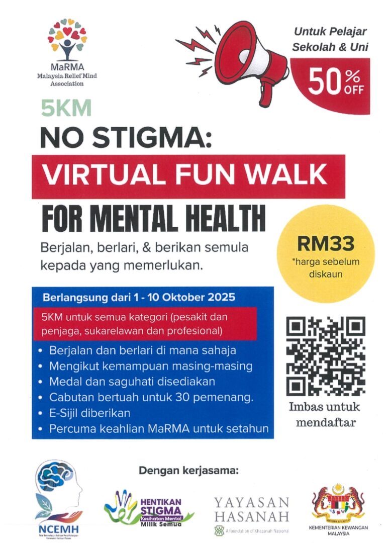 • new Hebahan UKL : 5km No Stigma: Virtual Fun Walk For Mental Health (Updated on 01 Oct, 2025)