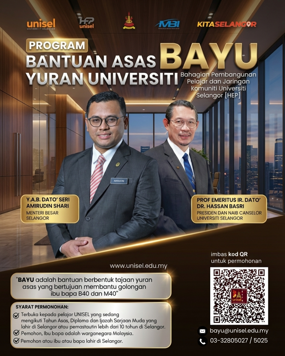 Hebahan PPJK | HEP - Penangguhan Sementara Perkhidmatan Shuttle Bus Unisel Dari Kampus Bestari Jaya ke Stesen MRT Sg. Buloh (Updated on 06 Jan, 2026)- Memo Unit BAYU | UNISEL - Memo Bantuan Asas Yuran Universiti (BAYU) Kelulusan Pelajar Baharu Semester November 2025 (Updated on 19 Dec, 2025)